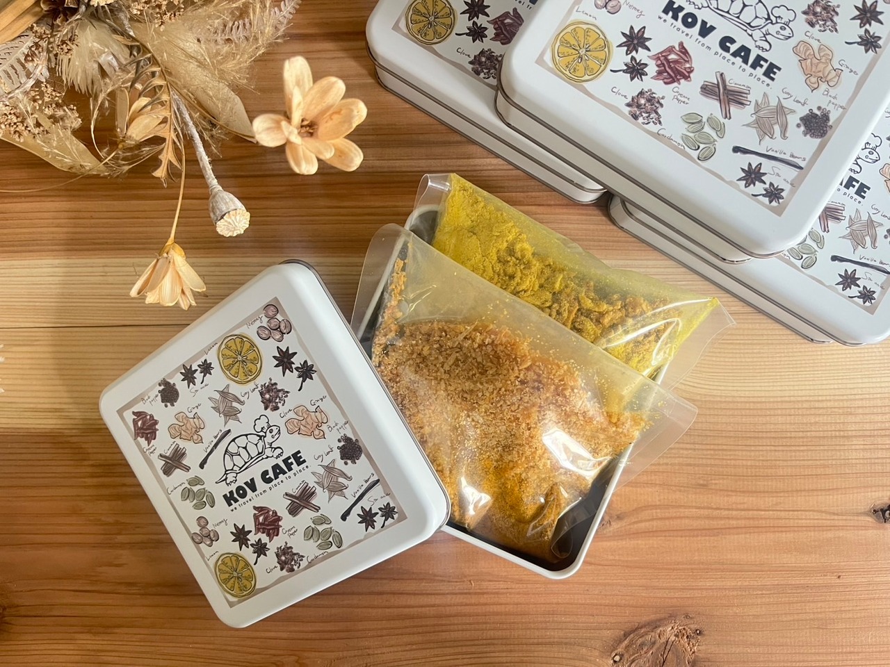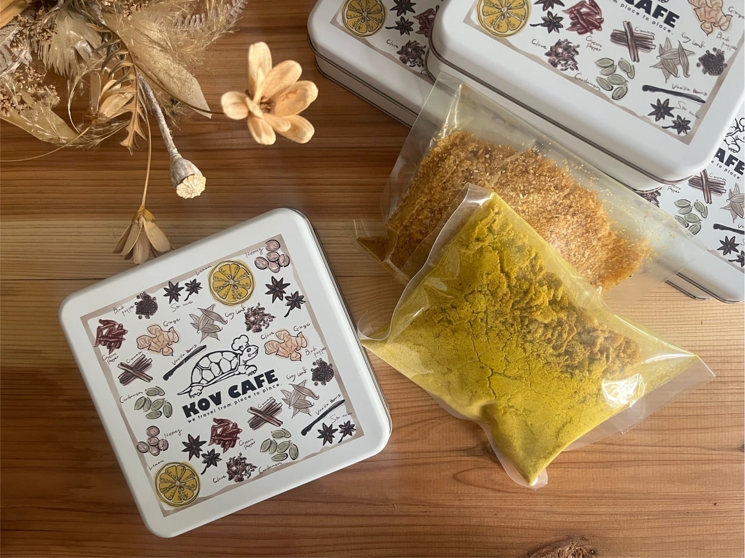 上記2種類のスパイスを1袋ずつ、コブカフェオリジナルスパイス缶に詰め合わせてお届けします(レシピ付き)
