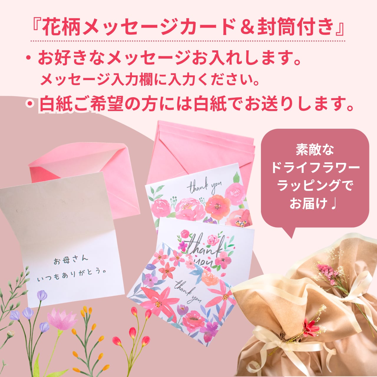 ・そのまま渡せる。 ドライフラワーを添えたラッピングとメッセージカード付き。