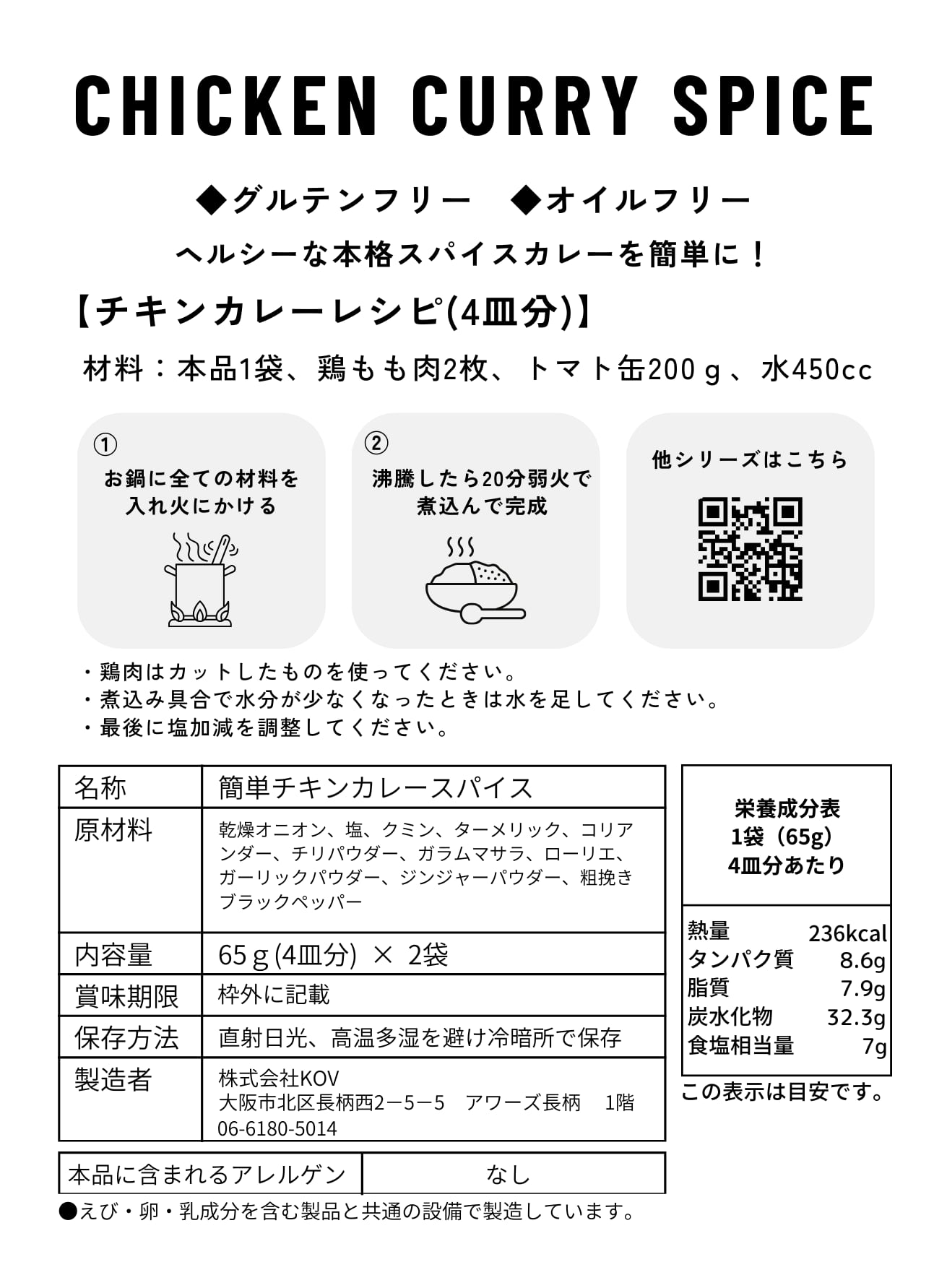 乾燥オニオン、塩、クミン、ターメリック、コリアンダー、チリパウダー、ガラムマサラ、ローリエ、ガーリックパウダー、ジンジャーパウダー、粗挽きブラックペッパー
